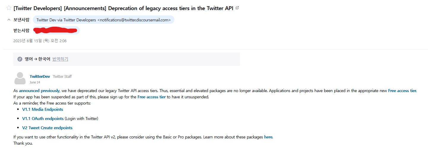 갑자기 트위터가 v1 API를 지원종료한다고 메일을 보내왔다.